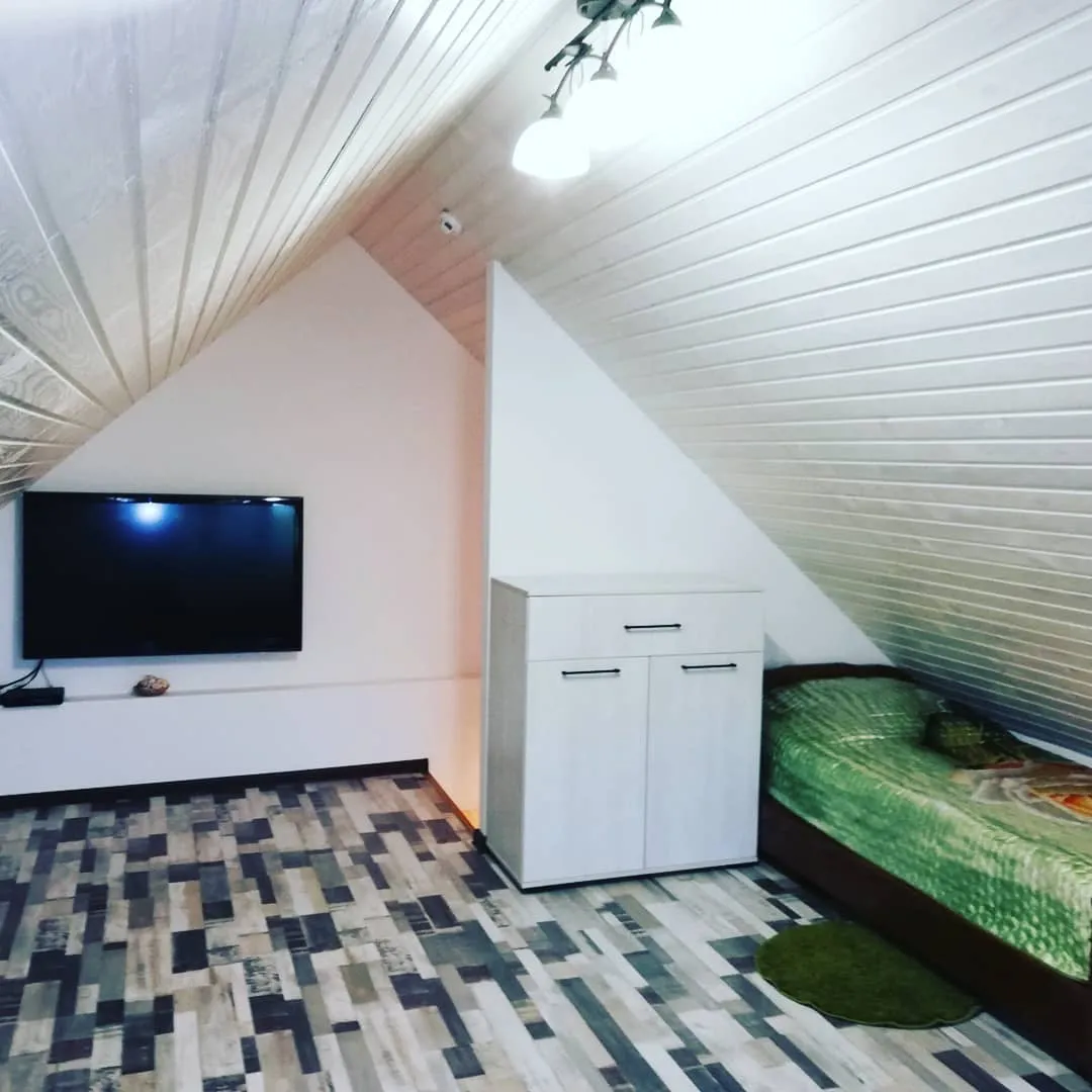 На первом этаже имеется диван-кровать, на мансардном этаже диван-кровать, двуспальная кровать, две односпальные кровати, обеспечиваем постельным бельём. На каждом из этажей имеется LED-телевизор.