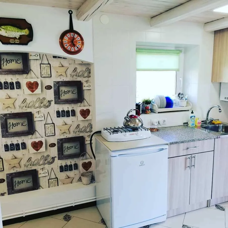 Кухня: холодильник, газовая плита, СВЧ-печь, вся необходимая посуда, мойка с холодной и горячей водой. Обеденная зона находится за стенкой от кухни возле камина с видом на террасу.